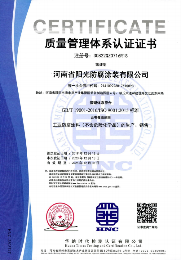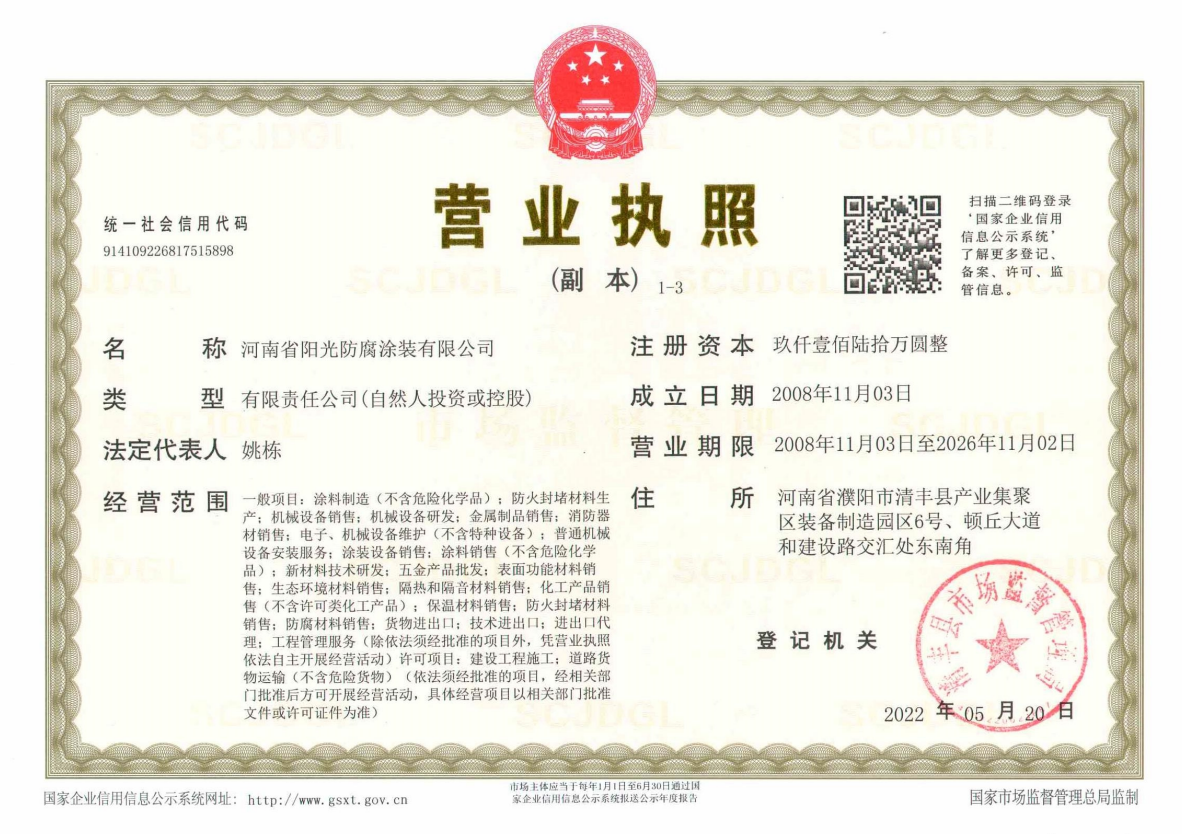 河南省陽光防腐涂裝有限公司為中石油涂料生產(chǎn)定點廠,中海油三新協(xié)作中心成員單位,中國腐蝕與防腐學會會員單位
